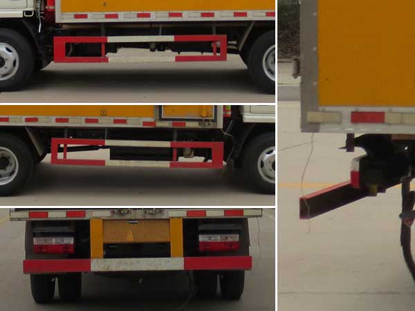 随底盘选装驾驶室;厢体顶部封闭,不可开启;运输具有独立容器(瓶)包装的易燃气体:液化石油气,原油气,压缩天然气,乙炔,甲烷,乙烷,丙烷,丁烷,丙烯,丁烯,二甲醚,打火机或打火机加油器(装有易燃气体),压缩氢,类项号:2.1;运输具有独立容器(瓶)包装的非易燃无毒气体:液化气体(非易燃,充有氮,二氧化碳或空气),压缩氧(氮,空气,氦,氩,氖),二氧化碳,类项号2.2;该车为危险品货物运输车;厢体选装瓦楞板结构,厢体侧面选装开门型式及位置或不带侧开门,选装百叶窗,选装液压升降尾板(收起状态水平长度为290mm);仅采用CY4BK551,YC4FA115-50,D28D11-5DA,发动机所有发动机对应油耗值均为12.5L/100km;仅采用前轮盘式制动器,前置排气管,子午线轮胎,限速装置的底盘,限速80km/h;该车安装具有卫星定位功能的行驶记录仪;ABS厂家及型号:襄阳东风隆诚机械有限责任公司/ABS/ASR-24V-4S/4M;侧面防护及后下部防护装置材料材质:Q235,连接方式:焊接加螺栓连接;后下部防护装置断面尺寸(宽赘?:50?00(mm),离地高度:490mm. |