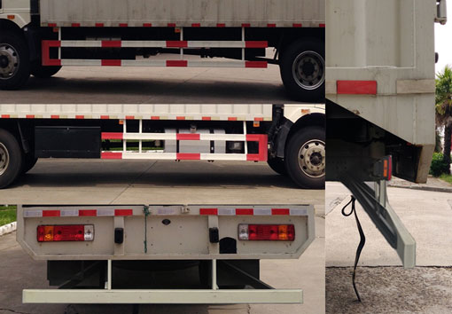 装备限速装置,限速79km/h,排气后处理器前置,前轴装配盘式制动器,采用子午线轮胎及后轴为空气悬挂结构;车厢顶部封闭,不可开启;该车主要用于运输具有独立容器(瓶)包装的:粘合剂,涂料,涂料溶液,煤油,苯,甲醇,乙醇,丙酮,甲苯,二甲苯,类项号: 3;选装车厢双侧门,单开门及蜂窝板车厢,厢体侧面板选装开百叶窗;安装具有卫星定位功能的行驶记录仪;ABS系统生产厂家1:WABCO,型号:4460043200,ABS系统生产厂家2:长春科密汽车制动有限公司,型号:CM4XL.发动机CA4DK1-22E51,CA4DK1-18E51,CA6DH1-22E5对应的油耗申报值(L/100km)为27.7,27.7,29.9;仅采用5300与5800轴距,总长/车厢长/轴距/后悬/离去角/整备质量:①9160/6800/5300/2460/10/7810;②9360/7000/5300/2660/10/7810;③10060/7700/5800/2860/9/8200;④10160/7800/5800/2960/9/8200;⑤10360/8000/5800/3160/8/8200;整备质量,载质量,载质量利用系数一一对应;侧防护材质为钢板Q235A,连接方式为螺栓连接;后防护材质为钢板Q235A,连接方式为螺栓连接,后防护截面尺寸为120mmX80mm,后防护离地高440mm; 该车后轴为采用空气悬架. |