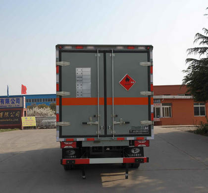 厢体顶部封闭,不可开启;厢体选装无侧门;选装多种形式的侧开门;车身侧面及后部粘贴橙色反光标识和易燃液体菱形标示,在车体后部设置安全标示;该车为危险货物运输车;用于运输具有独立容器(瓶)包装的涂料,涂料溶液,煤油,苯,甲醇,乙醇,丙酮,甲苯,二甲苯,类项号:3;该车安装具有卫星定位功能的行驶记录仪;防护装置材料为Q235,与车辆连接方式为螺栓连接;后防护断面宽100?0mm,离地高450mm;ABS系统型号:APG3550500A6,VIE ABS-II,ABS系统控制器生产企业为浙江亚太机电股份有限公司,浙江万安科技股份有限公司;仅用子午线轮胎,仅用底盘限速装置及前盘制动;仅选用底盘的前置排气管结构;随底盘选装前围和相关附件;对应油耗:SC28R125Q5A(12.76),SOFIM8140.43DV(12.7);随底盘选装前部、侧面标识及格栅造型 |