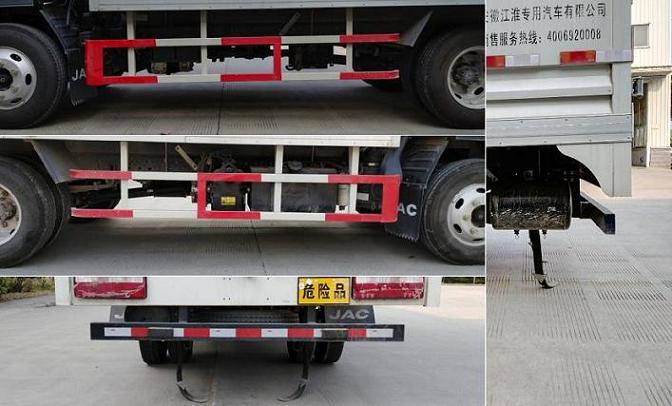 该车为危险品运输车,货厢结构为厢式,车厢顶部封闭,不可开启;选装厢体右侧双开门,单开门,不开门各种形式;随底盘选装改前围面板,前组合灯具,进气格栅,前保险杠,左右视镜的驾驶室;随底盘选装框架式组合视镜,补盲镜;选装液压尾板,尾板收起状态的水平长度为280mm;用于运输具有独立容器(瓶)包装的易燃液体:粘合剂,涂料,料溶液,油漆,机油,废机油,苯,甲醇,乙醇,丙酮,甲苯,二甲苯等,类项号为第3类;侧后防护材料为Q235A,螺栓连接,后防护截面尺寸(高卓?为100mm?0mm,离地高度为470mm;选用危险品运输车专用底盘,ABS控制器型号及生产企业:CM4XL-4S/4M,广州科密汽车电子控制技术股份有限公司;前轮安装盘式制动器,安装子午线轮胎,安装限速装置,限速80km/h,排气管前置,安装带卫星定位功能的行驶记录仪;发动机WP3Q130E50,D25TCIE1对应的油耗申报值(L/100km)为12.2,12.7;选装后下部防护装置材料/连接方式:Q235A/螺栓连接,断面尺寸(直径)/离地高度(mm):100/480。. |