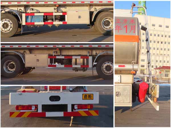 罐体尺寸:罐长8.9米,长轴2.36米,短轴1.58米.有效容积26.1立方米.侧后防护材质均为碳钢,螺栓连接.后防护截面尺寸为120x50(高x宽)毫米,下平面距地高为480毫米.装配限速装置,限速79km/h;排气尾管前置,前置消声器;前轴装配盘式制动器.ABS系统生产厂家: 长春瑞立科密汽车电子有限公司/威伯科汽车控制系统(中国)有限公司,型号:CM4XL/ABS-E 4S/4M;安装具有卫星定位功能的行驶记录仪.危险货物运输车辆的车辆类型FL.该车型为危险货物运输车辆,危险类项号:3.选装:罐顶防护栏、左右两侧护栏处箱子结构、左右两侧后悬处护栏、灭火器箱样式、车辆左右两侧后部箱子.采用底盘1900+4500+1350(mm)轴距.发动机与油耗值对应关系:CA6DL6-36E6(38.39L/100km),CA6DK1-32E6(38.45L/100km).该车转向轮已随底盘装备轮胎爆胎应急防护装置.选装EBS,EBS型号:EBS3,EBS系统生产厂家:威伯科汽车控制系统(中国)有限公司.该车型可选装ETC车载装置 |