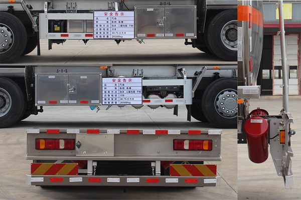 罐体有效容积:30.75立方米;罐体外形尺寸:长 9100毫米,长轴 2422毫米,短轴 1762毫米;危险货物运输车辆类型:FL 型车辆;危险品类项号:3;侧面防护装置材质:铝合金,连接方式:螺栓连接;后下部防护装置材质:铝合金,连接方式:螺栓连接,断面尺寸 120?0 毫米,离地高度 450 毫米;选装软管箱样式;选装尾部两侧工具箱,选装罐体后部照片,灭火器样式,路障支架,中部左右结构样式;排气管前置;前轮采用盘式制动器;采用子午线轮胎;采用限速装置,限速80千米/小时;安装具有卫星定位功能的行驶记录仪;ABS生产厂家: 威伯科汽车控制系统(中国)有限公司;威伯科汽车控制系统(中国)有限公司,ABS型号: 4460046300;4461352410.仅选用发动机MC07.34-50;MC07.31-52;MC07.34-52对应的油耗值(L/100km)为:42.7;42.5;42.5. 该车后轴为采用空气悬架.转向轮装备轮胎爆胎应急防护装置. |