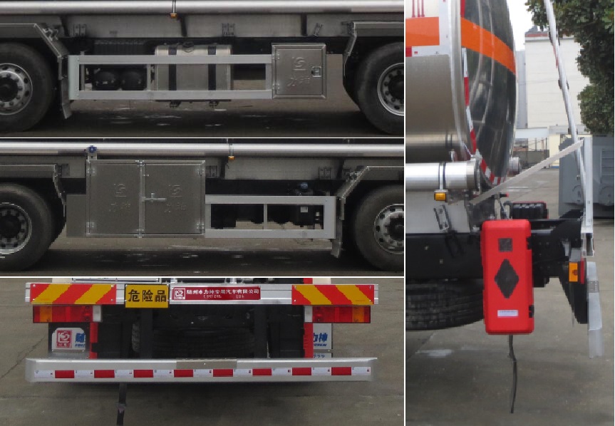 罐体有效容积:26立方米,危险货物运输车辆的类型为FL型,介质类项号:3;罐体尺寸(长壮ぶ嶙短轴)(mm)为:8400?350?650;侧、后防护装置材料材质:Q235B,侧、后防护均采用螺栓连接,后防护装置断面尺寸为(mm):80?50,后部防护离地高度:500mm;随底盘选装驾驶室,选装箱门样式及管厢样式;安装具有卫星定位功能的行驶记录仪,排气管前置,安装前轮盘式制动器和限速装置,限速80km/h,仅采用底盘子午线轮胎;ABS型号/生产厂家:ABS 8/东科克诺尔商用车制动系统(十堰)有限公司;发动机型号及油耗值(L/100km)为:DDi75E350-60(38.1).该车后轴为采用空气悬架.转向轮安装爆胎应急防护装置. |