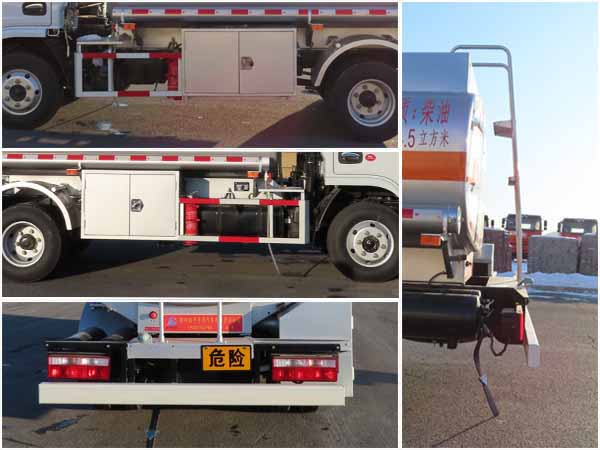罐体尺寸:罐长3.85米,长轴1.7米,短轴0.97米.有效容积4.5立方米.侧后防护材质均为碳钢,螺栓连接.后防护截面尺寸为120x60(高x宽)毫米,下平面距地高为475毫米.ABS厂家及型号:襄阳东风隆诚机械有限责任公司/ABS/ASR-24V-4S/4M.安装前置排气管,前轮盘式制动器.安装具有卫星定位功能的行驶记录仪,安装限速装置,最高车速80km/h.危险货物运输车辆的车辆类型FL.危险类项号:3.该车型为危险货物运输车辆.加油机型号/厂家:JSK-70B1121CZ/稳恩佳力佳(北京)石油化工设备有限公司,CS20D1110F/正星科技有限公司,BL1111Z/珠海市贝林加油设备有限公司.选装:罐顶防护栏、灭火器筒样式及安装位置、挡泥板样式.随底盘选装驾驶室前围.该车转向轮已随底盘装备轮胎爆胎应急防护装置.仅选用底盘3308mm轴距. |