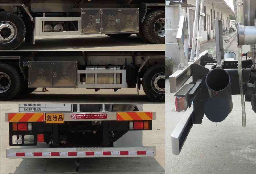 罐体有效容积:25.2立方米,危险货物运输车辆的类型:FL型车辆,类项号:3;罐体尺寸(长壮ぶ嶙短轴)(mm)为:8750?300?600;仅采用1800+4600+1400(mm)轴距;侧、后防护装置材质均为:Q235B,侧、后防护均采用螺栓连接,后部防护装置断面尺寸(宽赘?80?50(mm),后部防护离地高度:500mm;安装具有卫星定位功能的行驶记录仪,仅采用子午线轮胎,前盘制动器,排气管前置的底盘;安装限速装置,限速80km/h的底盘,随底盘选装驾驶室,选装挡泥板样式;ABS型号:ABS/ASR-24V-4S/4M,控制器型号:ABS/ASR-24V-4S/4M,厂家:东科克诺尔商用车制动系统(十堰)有限公司;ABS型号:44600XXXX0,控制器型号:44600XXXX0,厂家:威伯科汽车控制系统(中国)有限公司;发动机对应油耗值 (L/100km)为:F2CCE611A*L/42.8,F2CCE611B*L/42.8,该车后轴采用空气悬架;转向轮安装爆胎应急防护装置. |
