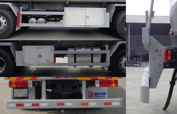 罐体有效容积:27.4立方米,危险货物运输车辆的类型:FL型车辆 ,类项号:3;罐体尺寸:长8900毫米,长轴2350毫米,短轴1650毫米;侧、后防护装置材质均为:Q235B,侧、后防护均采用螺栓连接,后部防护装置断面尺寸(宽赘?80?50(mm),后部防护离地高度:500mm;安装具有卫星定位功能的行驶记录仪,仅采用子午线轮胎,前盘制动器,排气管前置的底盘;安装限速装置, 限速80km/h的底盘,随底盘选装驾驶室,选装挡泥板样式;ABS生产厂家:上海万捷汽车控制系统有限公司,ABS型号:VIE ABS-II;发动机对应油耗值 (L/100km)为:CA6DK1-32E5(43.2),CA6DL1-32E5(43.2).该车后轴采用空气悬架;转向轮安装爆胎应急防护装置. |