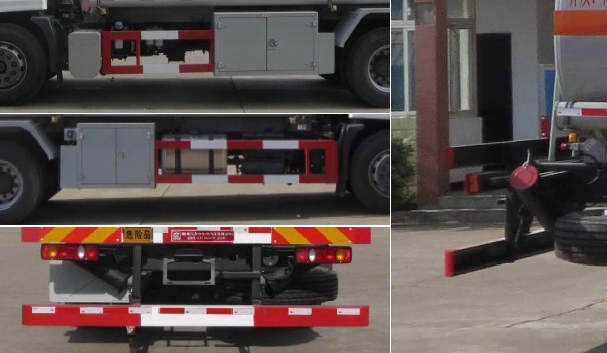 罐体有效容积:15立方米,危险货物运输车辆的类型为:FL型,类项号:3,罐体尺寸(mm)(长壮ぶ嶙短轴):5600?200?550,5720?160?500;轴距与后悬对应关系为(mm):4700/2270,5000/1970;随底盘选装驾驶室,选装挡泥板.侧、后防护装置材料材质:Q235B,后轴采用空气悬架,侧、后防护均用螺栓连接,后部防护装置断面尺寸(宽赘?80?50(mm),后部防护离地高度:500mm.安装具有卫星定位功能的行驶记录仪,安装前轮盘式制动器和限速装置,限速80km/h,仅采用底盘子午线轮胎.ABS型号:3631010-C2000,4460046440;生产厂家:东科克诺尔商用车制动系统(十堰)有限公司,威伯科汽车控制系统(中国)有限公司.发动机型号及油耗值分别为:ISD210 50(29.1),ISB210 50(29),ISB190 50(28.9).该车后轴采用空气悬架;转向轮安装爆胎应急防护装置. |