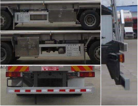 罐体有效容积:25.9立方米,危险货物运输车辆的类型为:FL型车辆,类项号:3,罐体尺寸:长8900毫米,长轴2300mm,短轴1600mm.仅采用1800+4575+1400mm轴距,随底盘选装驾驶室,选装挡泥板.侧,后防护装置材料材质:Q235B,侧,后防护均用螺栓连接,后部防护装置断面尺寸(宽赘?80?50(mm),后部防护离地高度:500mm.安装具有卫星定位功能的行驶记录仪,排气管前置,安装前轮盘式制动器及限速装置,限速80km/h,仅采用底盘295/80R22.5 18PR,12R22.5 18PR,11.00R20 18PR轮胎.ABS系统型号为4460046300,生产企业为威伯科汽车控制系统(中国)有限公司.发动机型号及油耗值(L/100km)为:MC07.28-50(43.4),MC07.31-50(43.5),MC07.34-50(43.8),MC07.35-50(43.9).该车后轴采用空气悬架;转向轮安装爆胎应急防护装置. |