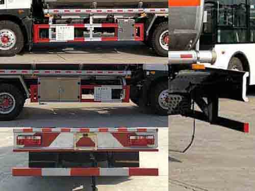 1、该车适用于危险品运输,运送危险货物车辆类型为:FL型,类项号:3。罐体有效容积:16.6立方米,运输介质:汽油,密度:700千克/立方米,罐体外形尺寸(长卓碜高)(mm): 6200?350?500。仅采用轴距4700mm。2、侧、后防护均采用Q235,侧防护螺栓连接,后防护焊接,截面高120mm,截面宽50mm,下边缘离地高450mm。罐体上部选装上走道。3、仅选用消声器前置、限速装置(限速80km/h)、前轮盘式制动及子午线轮胎的底盘;安装带有卫星定位功能的行驶记录仪;ABS型号/生产厂家: J ABS/焦作博瑞克控制技术有限公司。采用发动机ISB180 50的油耗值为28.0L/100km。 该车后轴为采用空气悬架.转向轮安装爆胎应急防护装置. |