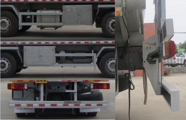 罐体有效容积:25.3立方米,危险货物运输车辆的类型:FL型车辆,类项号:3;罐体尺寸:长8800毫米,长轴2300毫米,短轴1600毫米;仅采用1800+4300+1350轴距;侧、后防护装置材质均为:Q235B,侧、后防护均采用螺栓连接, 后防护装置断面尺寸为(mm):80?50,后部防护离地高度:500mm;安装具有卫星定位功能的行驶记录仪,采用前盘制动器,排气管前置的底盘;安装限速装置,限速79km/h,仅采用底盘子午线轮胎;随底盘选装驾驶室,选装挡泥板样式;ABS系统型号为446 004 6300,ABS生产企业为威伯科汽车控制系统(中国)有限公司;发动机/油耗值(L/100km)对应关系: MC07.28-50/40.2,MC07.31-50/40.2,MC07.34-50/40.2.该车后轴采用空气悬架;转向轮安装爆胎应急防护装置. |