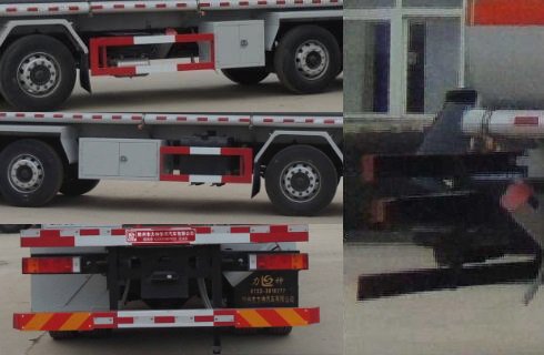 罐体有效容积:27.3立方米,危险货物运输车辆类型为FL型,类项号:3;罐体尺寸:长8400毫米,长轴2400毫米,短轴1700毫米;侧、后防护装置材料材质:Q235B,侧、后防护均用螺栓连接,后部防护装置断面尺寸(宽赘?80?50(mm),后部防护离地高度:500mm;随底盘选装驾驶室,选装挡泥板样式,安装具有卫星定位功能的行驶记录仪,安装前轮盘式制动器,排气管前置,限速装置,限速80km/h的底盘,仅采用底盘子午线轮胎;ABS厂家及型号:东科克诺尔商用车制动系统(十堰)公司,3631010-C2000;发动机与油耗值(L/100km)分别为:ISD270 50(41),YC6A270-50(40.9).该车后轴采用空气悬架;转向轮安装爆胎应急防护装置. |