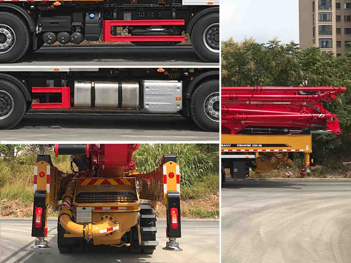 | 后伸1790mm,第一、二轴轮胎为385/65R22.5,第三、四轴轮胎为315/80R22.5.该车为专用作业车辆,用于混凝土输送,主要固定装置为混凝土输送泵,臂架等.侧防护栏的横杆材质为SPCC型钢,撑杆材质为Q235B,连接方式为螺栓连接.后部为混凝土料斗工作装置,离地高度495mm,起后下部防护作用。该底盘ABS系统型号为EBS7 ECU,生产企业为KNORR.底盘发动机型号D13K500 EU6,最大净功率为375kW.选装尾部标志板位置、牌照板位置及料斗盖板。选装一种工具箱。 |