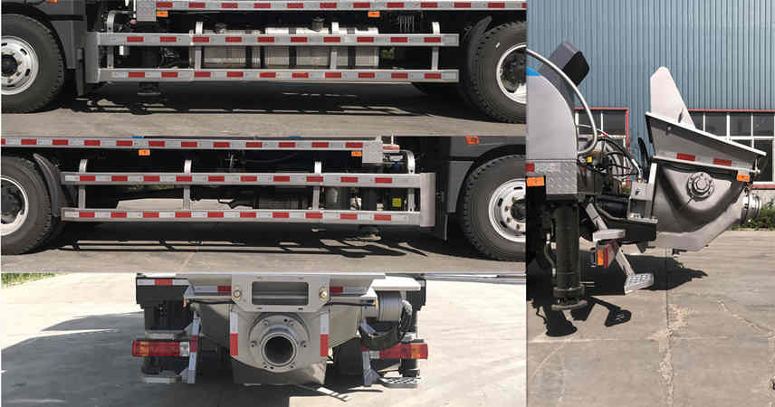 该车仅采用4900mm轴距底盘,侧防护均安标准要求进行制作及安装,侧防护装置所用材料材质为:Q235-A;连接方式为:与车架螺栓连接;由于车辆的正后部位置安装的是一个用于中转、泵送混凝土的大料斗,其最下端离地高度为450mm,所以就没再设计后防护装置.上装主要结构件均为我公司自制.底盘安装有ABS,ABS系统型号为VIE ABS-II生产企业为上海万捷汽车控制系统有限公司.车辆顶部选装进气、排气系统装置,不加装和加装后对应的整车高度分别为2910mm和3075mm.随底盘选装新款驾驶室,随底盘选装限速装置限速89km/h. |