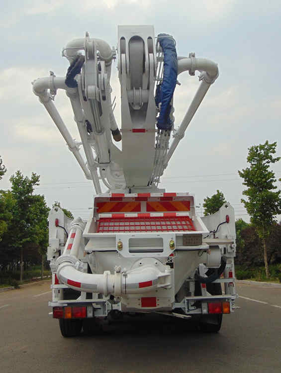 该车为专用作业车辆,用于混凝土输送,主要固定装置为混凝土输送泵,臂架等.后伸因选装不同长度的臂架而变化,车长/后伸(mm)对应关系:13580/915,13830/1165,14080/1415,14610/1945.侧防护装置的材质为Q235-A,连接方式为与车架螺栓连接;后防护装置为车身专用装置代替,离地高度为480mm.尾部弯管可以选装在左侧或右侧.ABS系统型号为APG3550500H1,生产企业为浙江亚太机电股份有限公司 |