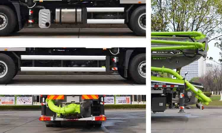 该车型专用功能为泵送混凝土,专用装置为混凝土泵送单元、臂架、输送管、支腿;发动机型号/最大净功率: MC07.31-50/225kW;该车可选装臂架,输送管,散热器;ABS系统型号为4460046300,生产企业为威伯科汽车控制系统(中国)有限公司;该车侧面防护装置所用材料材质为铝合金,通过螺栓与支架连接,支架与底盘大梁通过螺栓连接;后部专用装置具有后下部防护功能,离地高度440mm;该车型可选装料斗;车长9800mm对应后悬3280mm,车长9900mm对应后悬3380mm. |
