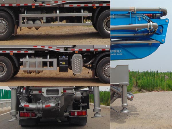 该车为特种作业类车辆,用于混凝土输送,主要固定装置为混凝土输送泵,臂架等.车长/后伸(mm)对应关系:13750/1208,14020/1478,14300/1758,14800/2258.侧防护装置的材质为Q235A,与车架螺栓连接;后防护装置由料斗及支腿等专用装置代替,起后下部防护作用,离地高度为450mm.ABS系统型号为4460046300,生产企业为威伯科汽车控制系统(中国)有限公司. |