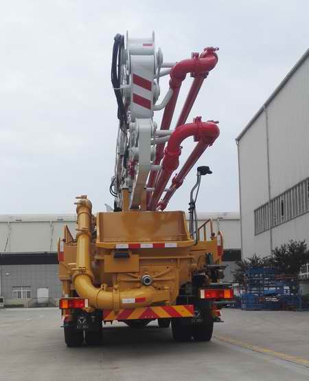 该车为专用作业类车辆,用于混凝土泵送。专用作业装置为混凝土泵送装置。仅选用底盘5200mm轴距,总长为10080mm时,后悬为3063,后伸为497mm;总长为9900mm时,后悬为3380mm.侧防护装置为金属护栏,材质为Q235,截面高度100mm,连接方式为螺栓连接,选装侧面防护装置,材质为铝合金,截面高度为120mm。后部防护位置为专用作业装置(混凝土料斗)替代,离地高度为490mm。ABS系统型号为4460046300,生产企业为威伯科汽车控制系统(中国)有限公司.选装尾部标志板安装位置。 |