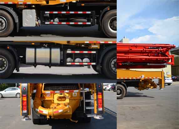 该车为专用作业车辆,后伸为1100mm(1180mm/1380mm),整车长及对应的后伸尺寸为(整车长/后伸):13800/1100;13880/1180;14080/1380mm,用于混凝土输送,主要固定装置为混凝土输送泵,臂架等.发动机净功率值:ISGe5-430发动机的最大净功率为315kw.ABS系统型号/生产企业对应关系:44600XXXX0/威伯科汽车控制系统有限公司;ABS/ASR-24V-4S/4M/东科克诺尔商用车制动系统(十堰)有限公司。该车侧面防护装置横杆材料为Q345B,撑杆材料为冷弯空心型钢J50*50*4/Q345B,连接方式均为螺栓连接;后部为混凝土料斗工作装置,料斗最下端离地高度为480mm,起后防护作用。 |