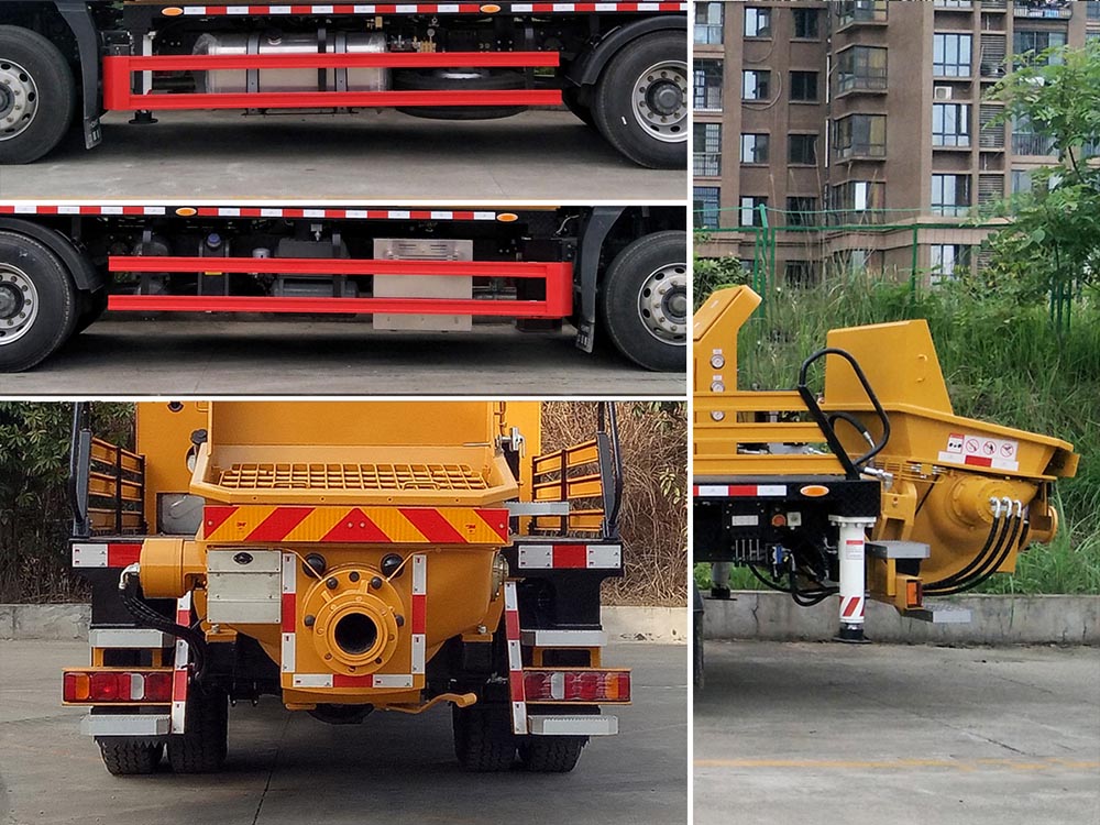 该车为特种作业类车辆,用于混凝土输送,主要固定装置为混凝土输送装置等。该车轴距为4900mm。侧防护栏的材质为SPCC型钢,连接方式为螺栓连接;后部为混凝土料斗工作装置,料斗最下端离地高度为500mm,起后下部防护作用。装有ABS,ABS型号:4460046300;生产厂家:威伯科汽车控制系统(中国)有限公司。选装一种支腿。 |