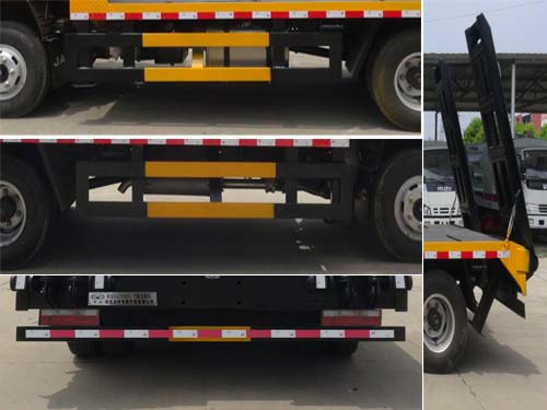 随底盘选装驾驶室,选装不带后爬梯结构,选装带折叠爬梯;该车专用装置为平板,仅用于运送不可拆解物体;ABS控制器型号/厂家:4S4M/浙江万安科技股份有限公司;侧、后防护材料均为:Q235;侧、后防护均采用焊接连接;,后下部防护装置截面尺寸(mm):100?0,离地面高度480mm。整车长(mm)/轴距(mm)/前悬(mm)/后悬(mm)一一对应:5995/3308/1100/1587;5995/3308/1075/1612;5995/3600/1120/1275;仅采用发动机型号与油耗一一对应:4B2-115C50/12.51(L/100km),YNF40E1/12.39(L/100km),HFC4DA1-2D/12.45(L/100km),D25TCIE1/12.44(L/100km),ISF3.8s5154/12.36(L/100km),YNF40E2/12.32(L/100km),WP3Q130E50/12.62(L/100km)。爬梯收起状态的水平长度为280mm. |