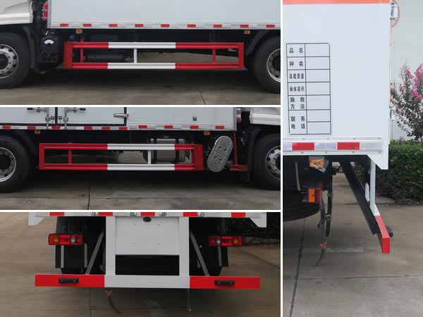 ABS型号:3631010-C2000,EBS5,ABS 8;ABS生产企业:东科克诺尔商用车制动系统(十堰)有限公司,东科克诺尔商用车制动系统(十堰)有限公司,东科克诺尔商用车制动系统(十堰)有限公司;安装有限速装置;限速装置限速(km/h):80;安装有具有卫星定位功能的行驶记录仪;选装描述:随底盘选装驾驶室;厢体侧面选装开门型式及位置或不带侧开门;该车型可选装ETC车载装置;仅采用底盘4700mm,5000mm轴距;发动机/油耗值(L/100km)对应关系为:B6.2NS6B210/25.9,DDi50E190-60/25.9;侧后防护情况:侧面防护及后下部防护装置材料材质:Q235,连接方式:焊接加螺栓连接;后下部防护装置断面尺寸(宽赘?:50?20(mm),离地高度:420mm;车厢顶部封闭且不可开启;运输独立容器(瓶)包装的货物;EX/Ⅲ型车辆;危险货物类项号:1.1 D,1.1B,1.1G ,1.1C,1.3C,1.4G;其他说明:仅采用前轮盘式制动器,前置排气管,子午线轮胎,转向轮安装爆胎应急防护装置;后轴采用空气悬架; |
