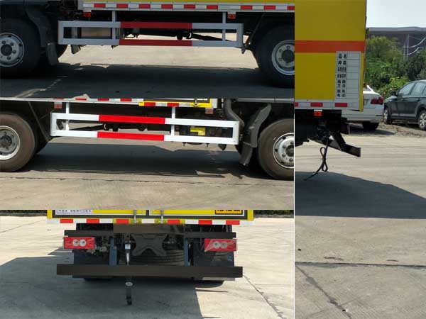 ABS型号:ABS-E;ABS生产企业:威伯科汽车控制系统(中国)有限公司;安装有限速装置;限速装置限速(km/h):80;安装有具有卫星定位功能的行驶记录仪;选装描述:采用3800mm轴距底盘,随底盘选装驾驶室;发动机/油耗值(L/100km)对应关系为:F3.8NS6B156/17.17;侧后防护情况:侧防护装置材料为Q235,与车辆连接方式为螺栓连接;后防护装置材料为Q235,与车辆连接方式为焊接连接;后防护断面宽100?0mm,离地高430mm;车厢顶部封闭且不可开启;运输独立容器(瓶)包装的货物;EX/Ⅲ型车辆;危险货物类项号: 1.1B、1.1C、1.1 D、1.1G、1.2C、1.3C、1.4 D、1.4G;其他说明:仅采用前盘制动和排气管前置底盘;仅用子午线轮胎,转向轮安装爆胎应急防护装置; 该车可选装ETC车载装置; |