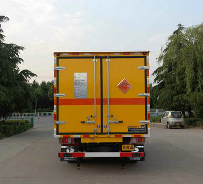 厢体顶部封闭,不可开启;选装无侧门;选装多种形式的侧开门;车身侧面及后部粘贴橙色反光标识和爆炸品菱形标示,在车体左、右、后部设置安全标示;危险货物运输车辆的车辆类型EX/Ⅲ;运送类项号:1.1D,1.1B,1.1G,1.1C,1.3C,1.4G;该车安装具有卫星定位功能的行驶记录仪;防护装置材料:Q235,与车辆连接方式为螺栓连接;后防护断面宽100?0mm,离地高425mm;发动机最大净功率为:JX4D30B6H(83kw).液刹ABS系统型号:APG3550500A,ABS系统生产厂家:浙江亚太机电股份有限公司;气刹ABS系统型号: VIE ABS-II,ABS系统生产厂家: 浙江万安科技股份有限公司;仅用子午线轮胎,仅用底盘限速装置及前盘制动;仅选用底盘的前置排气管结构;仅选用底盘JX4D30B6H发动机,该发动机对应VIN:LEFYECG2鬃鬃鬃鬃子秃亩杂叵?JX4D30B6H(11.19);选装不同规格,不同数量的抗爆容器;转向轮安装爆胎应急防护装置;该车型可选装ETC车载装置 |