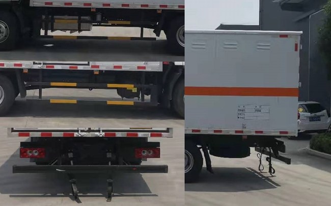 该车为危险货物运输车辆,类型为EX/Ⅲ型;厢体顶部密封,不可开启;选装无侧门厢体;用于运输具有独立容器(瓶)包装的爆炸品,运送爆炸品的类项号:1.1D,1.1B,1.1G,1.1C,1.3C,1.4G;侧防护及后防护装置所用材料均为Q235,连接方式均为螺栓连接,后下部防护装置离地高度420mm,截面尺寸100mm?0mm;ABS系统型号:ABS-VI.E;生产企业:广州瑞立科密汽车电子股份有限公司.ABS系统型号:ABS-E;生产企业:威伯科汽车控制系统(中国)有限公司;该车安装有卫星定位功能的行驶记录仪,仅选用排气管前置、前盘制动、子午线轮胎和限速装置的底盘,限速80km/h;装备有导静电装置;装备防爆胎应急装置;发动机F3.8NS6B156,CY4SK261最大净功率为112kw,122kw,油耗为17.09L/100Km,18.07L/100Km.该车型可选装ETC车载装置.仅选用前轮距1730mm的底盘;选装排半驾驶室 |