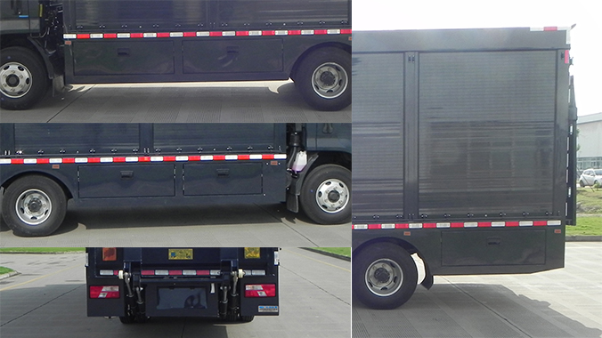 1、车厢顶部封闭不可开启2、选装车顶升降照明灯高3380mm,选装车顶场地照明灯高3240mm,选装前防撞架长7190mm,对应前悬1330mm。选装后牌照板样式,选装尾部不开门,选装尾部不带液压尾板。3、侧防护及后防护为裙边结构,防护装置左右对称,侧防护裙边最大离地高度380mm,后防护裙边最大离地高度480mm。4、配备防爆罐、爆破器材固定架等专用装置,该车主要用于警用部门排爆器材运送。5、ABS系统型号: VIE ABS-II,ABS系统生产厂家: 浙江万安科技股份有限公司。发动机最大净功率:110kw,发动机JX4D306H,对应油耗14.3。6、尾板收起长度280mm,尾板质量350kg。7、该车型可选装ETC车载装置。 |