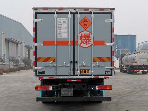 厢体顶部封闭,不可开启,厢体两侧均可选装1个或2个单侧门或双开侧门,也可选装无侧门厢体,侧门和后门可以选择单门杠或者双门杠。用于运输具有独立容器包装的:黑火药,压缩黑火药,电引爆雷管,非电引爆雷管,爆破炸药,专用烟火制品,无烟火药,糊状火药,商品爆炸装药(不带雷管),射弹,聚能装药(不带雷管),导爆索(软的),油井用弹药筒,推进剂,动力装置用弹药筒。运输介质类别和项别号:1.1D,1.1D,1.1B,1.1B,1.1D,1.1G,1.3C,1.3C,1.1D、1.2D,1.1D,1.1D、1.4D,1.1D,1.3C,1.1C,1.2C;该车仅使用排气管前置、前轮为盘式制动器、装配子午线轮胎的底盘,转向轮安装轮胎爆胎应急防护装置,后轴采用空气悬架,仅使用4700轴距;该车装有ABS,ABS系统型号/生产企业对应关系:ABS-E/威伯科汽车控制系统(中国)有限公司;ABS/ASR-24V-4S/4M/东科克诺尔商用车制动系统(十堰)有限公司;该车安装具有卫星定位功能的行驶记录仪,该车装配有限速装置,限速80km/h。侧、后防护连接方式均为:螺栓连接,侧防护材料:Q235,后防护材料:510L-6.0-GB/T 709,后防护断面尺寸(mm):120?0, 离地高度430mm;选装的后防护连接方式:螺栓连接,材料:Q235,后防护断面尺寸(mm):120?0, 离地高度480mm;仅使用发动机B6.2NS6B210,F4.5NS6B220,对应的油耗值分别为26.0L/100km,24.4L/100km;车辆类型EX/Ⅲ |