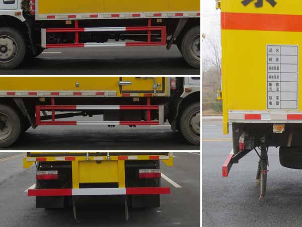 厢体顶部封闭,不可开启;随底盘选装驾驶室;厢体侧面选装开门型式及位置或不带侧开门;仅采用底盘3800mm轴距;该车用于运输具有独立容器(瓶)包装的:黑火药,压缩黑火药,电(非电)引爆雷管,爆破用,专用烟火制品,无烟火药,糊状火药,爆破炸药,导爆索,软的,点燃导火索,射弹,带有爆炸装药,聚能装药,不带雷管,聚能炸药,不带雷管,非电引爆雷管组件,爆破用,油井用弹药筒,固态推进剂,动力装置用弹药筒,商品爆炸装药,不带雷管,运送爆炸品的项号:1.1 D,1.1 D,1.1B,1.1B,1.1G ,1.1C,1.3C,1.1 D,1.1 D,1.4G,1.1D,1.1 D,1.1B,1.1B,1.3C,1.1C,1.3C,1.1D;运送危险货物车辆的类型:EX/Ⅲ型车辆;仅采用前轮盘式制动器,前置排气管,子午线轮胎,限速装置的底盘,限速80km/h;转向轮安装爆胎应急防护装置;发动机与油耗申报值(L/100km)对应关系为:YCS04190-68/21.3,D25TCIF1/21.3,D30TCIF1/21.3,D40TCIF1/21.3,NV30-C6D/21.3,CY4SK261/21.3,CY4SK361/21.3,YCY30165-60/21.3;该车安装具有卫星定位功能的行驶记录仪;ABS型号/厂家:ABS型号:ABS/ASR-24V-4S/4M,厂家:襄阳东风隆诚机械有限责任公司;侧面防护及后下部防护装置材料材质:Q235,连接方式:焊接加螺栓连接;后下部防护装置断面尺寸(宽赘?:45?00(mm),离地高度:460mm:该车选装ETC. |