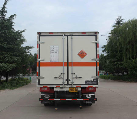 厢体顶部封闭,不可开启;该车车身侧面及后部粘贴橙色反光标识和爆炸品标志牌,在车体后部设置安全标示;危险货物运输车辆的车辆类型EX/Ⅲ;选装无侧门;选装多种形式的侧开门;选装瓦楞工艺厢体;选装1.4类爆炸品标志牌;运送爆炸品的项号: 1.1 D,1.1B,1.1G,1.1C,1.3C,1.4G;该车安装具有卫星定位功能的行驶记录仪;防护装置材料为Q235,与车辆连接方式为螺栓连接;后防护断面宽100?0mm,离地高450mm;ABS系统型号:ABS-VI.E;生产企业:广州瑞立科密汽车电子股份有限公司.ABS系统型号:ABS-E;生产企业:威伯科汽车控制系统(中国)有限公司.仅用子午线轮胎,仅用底盘限速装置及前盘制动;仅选用底盘的前置排气管结构;对应油耗:F3.8NS6B156(16.20),CY4SK261(16.09);该车型可选装ETC车载装置;转向轮安装爆胎应急防护装置 |