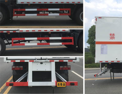 厢体顶部封闭,不可开启。该车为危险品运输车。随底盘选装驾驶室.前面罩,前组合灯具.运输介质:黑火药,压缩黑火药,电引爆雷管,爆破炸药,点燃导火索,硝胺炸药;运输爆炸品的项号:1.1D,1.1D,1.1B,1.1D,1.4G,1.1D.厢体侧面板选装开百叶窗,选装不带侧门,侧门型式及位置;侧面及后下部防护装置材料为Q235,与车架采用焊接连接.后下部防护装置断面尺寸(mm):50?20,离地高度:490mm.仅采用排气管前置、子午胎,限速装置,辅助制动装置和前盘制动器的底盘;限速80km/h.安装具有卫星定位功能的行驶记录仪; ABS系统生产厂家,型号 :焦作博瑞克控制技术有限公司,J ABS.安装具有卫星定位功能的行驶记录仪.转向轴已安装防爆胎装置.该车后轴仅采用空气悬架. |