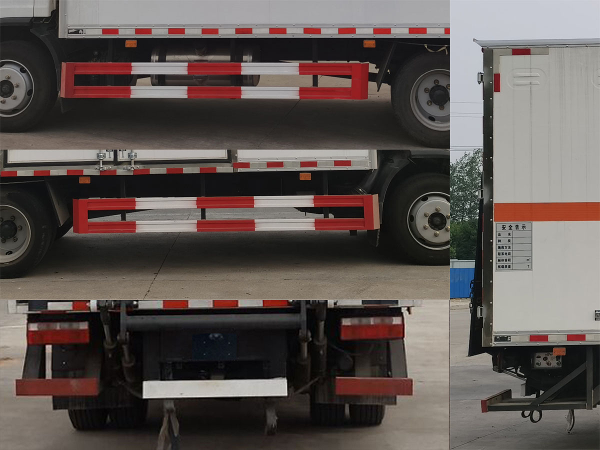 该车用于危险品运输,厢体顶部封闭,不可开启;介质类项号;1.1D,1.4G,1.1B,1.1C,1.3C;侧/后防护材料为Q235,侧防护螺栓连接,后防护焊接连接,截面尺寸100?0mm,下边缘离地高460mm;采用3900mm轴距;选装导流罩,选装新结构导流罩,选装排半驾驶室,选装侧开门,侧门单开门,侧门双开门,侧不开门,选装侧门型式及位置,选装瓦楞板;液压尾板收起状态的水平长度为290mm,尾板质量为420kg.仅选用排气管前置,限速装置(限速80km/h)、前轮盘式制动及子午线轮胎的底盘;转向轮安装轮胎爆胎应急防护装置;安装带有卫星定位功能的行驶记录仪;ABS生产厂家/型号:1.广州瑞立科密汽车电子股份有限公司/CM4XL-4S/4M;2.浙江万安科技股份有限公司/VIE ABS-II。发动机/油耗值(L/100km):WP3NQ160E61/21.3。 |