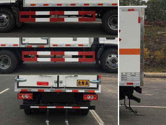 厢体顶部封闭,不可开启,转向轮安装轮胎爆胎应急防护装置,该车选装不同形式的单开侧门或双开侧门.危险货物运输车种类:EX/Ⅲ;该车用于运输具有独立容器(瓶)包装的爆炸品.运送爆炸品的项号:1.1D,1.1B,1.1G,1.1C,1.3C,1.2D,1.1C,1.4。采用发动机型号与油耗申报值(L/100km):F2.8NS6B131/11.47.ABS系统控制器型号/生产企业:ABS-E/威伯科汽车控制系统(中国)有限公司,ABS-VI稥/广州瑞立科密汽车电子股份有限公司.侧后防护材料:Q235,连接方式:侧防护采用螺栓连接,后防护采用焊接,后部防护断面尺寸(mm):100?0,后部防护离地高度(mm):450.该车安装带有卫星定位功能的行驶记录仪;仅采用前盘制动器和安装ABS以及前置消声器的底盘.采用子午线轮胎.安装限速装置最高车速80km/h.转向轮安装轮胎防爆应急防护装置。 |
