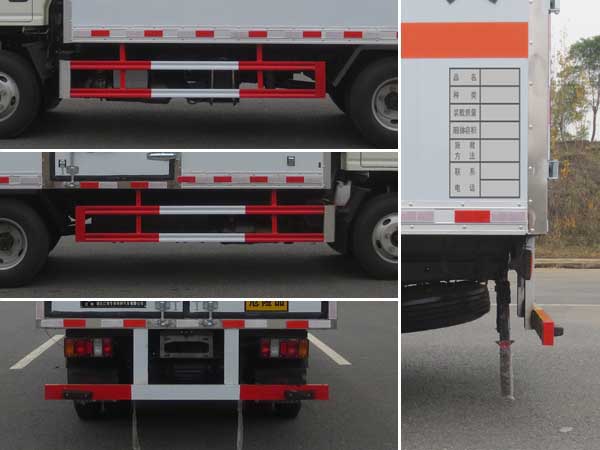 厢体顶部封闭,不可开启;厢体侧面选装开门型式及位置或不带侧开门;该车用于运输具有独立容器(瓶)包装的:黑火药,压缩黑火药,电(非电)引爆雷管,爆破用,专用烟火制品,无烟火药,糊状火药,爆破炸药,导爆索,软的,点燃导火索,射弹,带有爆炸装药,聚能装药,不带雷管,聚能炸药,不带雷管,非电引爆雷管组件,爆破用,油井用弹药筒,固态推进剂,动力装置用弹药筒,商品爆炸装药,不带雷管,运送爆炸品的项号:1.1 D,1.1 D,1.1B,1.1B,1.1G ,1.1C,1.3C,1.1 D,1.1 D,1.4G,1.1D,1.1 D,1.1B,1.1B,1.3C,1.1C,1.3C,1.1D;运送危险货物车辆的类型:EX/Ⅲ型车辆;仅采用前轮盘式制动器,前置排气管,子午线轮胎,限速装置的底盘,限速80km/h;转向轮安装爆胎应急防护装置;发动机/油耗申报值(L/100km)对应关系为:JX4D30B6H/11.0,JX4D30A6H/11.1;该车安装具有卫星定位功能的行驶记录仪;ABS系统型号:APG3550500A,ABS系统生产厂家:浙江亚太机电股份有限公司;侧面防护及后下部防护装置材料材质:Q235,连接方式:焊接加螺栓连接;后下部防护装置断面尺寸(宽赘?:50?00(mm),离地高度:400mm. |