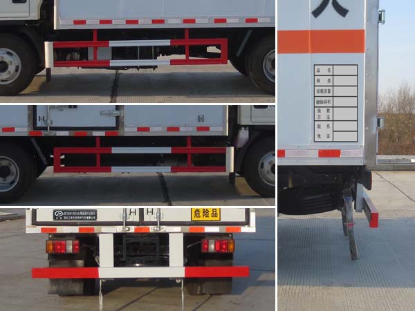 厢体顶部封闭,不可开启;厢体侧面选装开门型式及位置或不带侧开门;该车用于运输具有独立容器(瓶)包装的:黑火药,压缩黑火药,电(非电)引爆雷管,爆破用,专用烟火制品,无烟火药,糊状火药,爆破炸药,导爆索,软的,点燃导火索,射弹,带有爆炸装药,聚能装药,不带雷管,聚能炸药,不带雷管,非电引爆雷管组件,爆破用,油井用弹药筒,固态推进剂,动力装置用弹药筒,商品爆炸装药,不带雷管,运送爆炸品的项号:1.1 D,1.1 D,1.1B,1.1B,1.1G ,1.1C,1.3C,1.1 D,1.1 D,1.4G,1.1D,1.1 D,1.1B,1.1B,1.3C,1.1C,1.3C,1.1D;运送危险货物车辆的类型:EX/Ⅱ型车辆;仅采用前轮盘式制动器,前置排气管,子午线轮胎,限速装置的底盘,限速80km/h;转向轮安装爆胎应急防护装置;发动机与油耗申报值(L/100km)对应关系为:JX4D30B6H/11.1,JX4D30A6H/11.4,JX4D30C6H/11.4;该车安装具有卫星定位功能的行驶记录仪;液刹ABS系统型号:APG3550500A,ABS系统生产厂家:浙江亚太机电股份有限公司;气刹ABS系统型号: VIE ABS-II,ABS系统生产厂家: 浙江万安科技股份有限公司;侧面防护及后下部防护装置材料材质:Q235,连接方式:焊接加螺栓连接;后下部防护装置断面尺寸(宽赘?:50?00(mm),离地高度:460mm. |