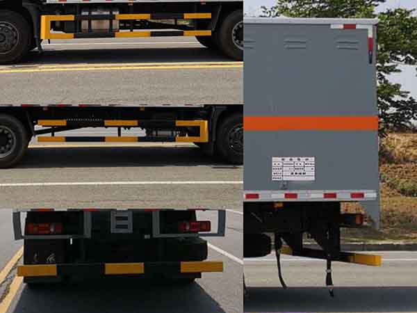 厢体顶部封闭,不可开启,随底盘选装不带前雾灯.选装不带驾驶室顶部装饰灯;厢体可选装不同形式的侧开门或无侧门。危险货物运输车种类:EX/Ⅲ运送爆炸品的品名:黑火药,压缩黑火药,电(非电)引爆雷管,爆破炸药,点燃导火索,硝胺炸药,射弹(带有爆炸装药)。运输介质类别和项别号:1.1D,1.1D,1.1B,1.1D,1.4G,1.1D,1.2D;侧面及后面防护装置材料均为Q235,连接方式均为螺栓连接,后部防护装置断面尺寸为120?0mm,离地高度为440mm;ABS型号:3631010-C2000,4460046440;生产厂家:东科克诺尔商用车制动系统(十堰)有限公司,威伯科汽车控制系统(中国)有限公司。仅选用底盘的4700轴距;仅采用ISD210 50、ISB210 50、ISB190 50型发动机油耗值均为:29.0L/100km.;该车安装有盘式制动器,限速装置,限速80km/h,消声器前置。该车仅使用子午线轮胎。该车安装具有卫星定位功能的行驶记录仪。 该车后轴为采用空气悬架. |