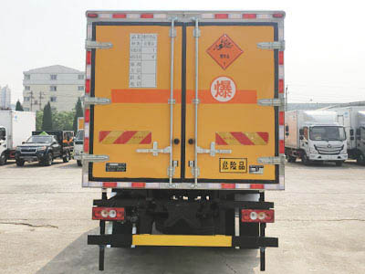 厢体顶部封闭,不可开启。厢体两侧均可选装1个或2个单侧门或双开侧门,单侧门可选择向左或向右开启,也可不装侧门。用于运输具有独立容器包装的:黑火药,压缩黑火药,非电引爆雷管,电引爆雷管,爆破炸药,点燃导火索,安全导火索,射弹,专用烟火制品,无烟火药,糊状火药,商品爆炸装药(不带雷管);类别和项别号:1.1D,1.1D,1.1B,1.1B,1.1D,1.4G,1.4S,1.2D,1.1G,1.3C,1.3C,1.2D。车辆类型EX/Ⅲ。该车仅使用排气管前置,前轮为盘式制动器,装配子午线轮胎的底盘,仅选用3800mm轴距,仅选用9.5R17.5 16PR或8.25R16LT 16PR轮胎;装配ABS,ABS系统控制器型号/生产企业:ABS-E/威伯科汽车控制系统(中国)有限公司。该车安装具有卫星定位功能的行驶记录仪,装配有限速装置,限速80km/h。侧防护,后防护与车辆均采用螺栓连接,材料均为:Q235,后防护断面尺寸(mm):120?0, 离地高度480mm。发动机F3.8NS6B156油耗值为18.3L/100km,最大净功率为112kw。 |