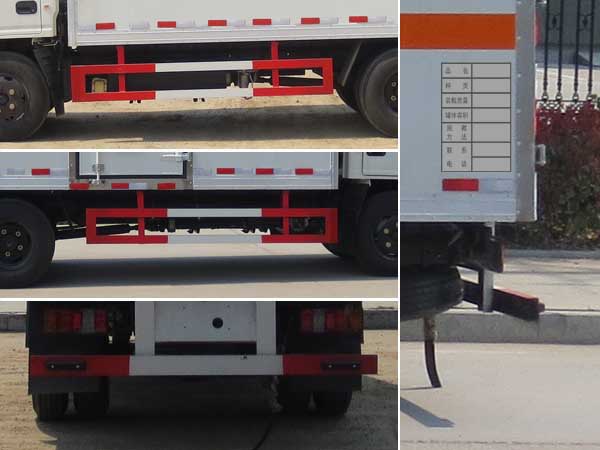 随底盘选装驾驶室;厢体顶部封闭,不可开启;运输介质:黑火药,压缩黑火药,电引爆雷管,爆破炸药,点燃导火索,硝胺炸药;运输爆炸品的项号:1.1D,1.1D,1.1B,1.1D,1.4G,1.1D;运送危险货物车辆的类型:EX/Ⅲ型车辆;厢体侧面选装开门型式及位置或不带侧开门;仅采用前轮盘式制动器,前置排气管,子午线轮胎,限速装置的底盘,限速80km/h;所有发动机对应油耗值均为11.9L/100km;该车安装具有卫星定位功能的行驶记录仪;ABS系统型号:APG3550500A,ABS系统生产厂家:浙江亚太机电股份有限公司;侧面防护及后下部防护装置材料材质:Q235,连接方式:焊接加螺栓连接;后下部防护装置断面尺寸(宽赘?:50?00(mm),离地高度:420mm. |