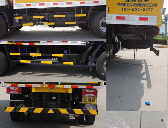 厢体顶部密封,不可开启,厢体两侧选装不同形式侧开门及开门位置或不带侧门.选装后门双拉杆,选装厢体外蒙皮.用于运输具有独立容器(瓶)包装的: 黑火药,压缩黑火药,电(非电)引爆雷管,爆破用,专用烟火制品,无烟火药,糊状火药,爆破炸药,导爆索,软的,点燃导火索,射弹,带有爆炸装药,聚能装药,不带雷管,聚能炸药,不带雷管,非电引爆雷管组件,爆破用,油井用弹药筒,固态推进剂,动力装置用弹药筒,商品爆炸装药,不带雷管.运送爆炸品的项号: 1.1 D,1.1 D,1.1B,1.1B,1.1G ,1.1C,1.3C,1.1 D,1.1 D,1.4G,1.1D,1.1 D,1.1B,1.1B,1.3C,1.1C,1.3C,1.1D 。该车为危险货物运输车辆,类型为EX/Ⅲ型.侧防护与车辆采用螺栓连接,后防护与车辆采用焊接+螺栓连接,材料均为Q235,后防护断面尺寸(mm):100?0, 离地高度470mm。该车安装ABS,限速器限速80km/h,前轮盘式制动器,排气管前置,有卫星定位功能的行驶记录仪,仅使用子午线轮胎;ABS 型号VIE ABS-Ⅱ,生产企业:浙江万安科技股份有限公司,型号CM4XL-4S/4M,生产企业:广州瑞立科密汽车电子股份有限公司.采用SC28R150Q6型发动机油耗值均为:15.94 L/100km;采用D30TCIF1型发动机油耗值均为:16.18 L/100km. |