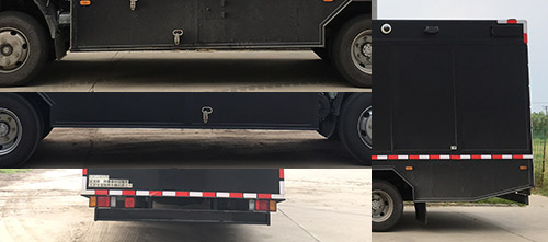顶部封闭,不可开启。车厢内部安装设备架,车厢顶部安装摄像头、卧式照明灯等专用装置,可运输排爆器材。车辆后防护材料Q235钢板,厚3.0mm,截面尺寸为140*50mm,离地高度420mm,连接方式:焊接。侧防护由1.5mm厚Q235钢板与50*30*1.5mm矩管焊接为群围结构,离地高425mm。ABS系统型号为APG3550500H1,生产企业为浙江亚太机电股份有限公司。发动机型号为4HK1-TC51,最大净功率为140kW,油耗为21.5L/100km。 |