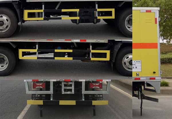 厢体顶部封闭,不可开启,厢体两侧均可选装1个或2个单侧门或双开侧门或不开侧门。此车选装加隔断;危险货物运输车辆类型:EX/Ⅲ;该车用于运输具有独立容器(瓶)包装的: 黑火药、压缩黑火药、电(非电)引爆雷管,爆破用、专用烟火制品、无烟火药、糊状火药、爆破炸药、导爆索,软的、点燃导火索、射弹,带有爆炸装药、聚能装药,不带雷管、非电引爆雷管组件,爆破用、油井用弹药筒、固态推进剂、动力装置用弹药筒、商品爆炸装药,不带雷管.运送爆炸品的项号: 1.1 D,1.1 D,1.1B,1.1G ,1.1C,1.1C,1.1 D,1.1 D,1.4G,1.1D,1.1 D,1.4B,1.3C,1.1C,1.3C,1.1D;侧面,后面防护装置的横杆材料为Q235,侧,后防护为螺栓连接,后防护断面尺寸100?0mm,后防护离地高度为440mm; 仅选装安装有ABS的底盘,ABS系统控制器型号为APG3550500A6,VIE ABS-II,ABS系统控制器生产企业为浙江亚太机电股份有限公司,浙江万安科技股份有限公司; 仅选装安装有盘式制动器,消声器前置的底盘。该车装备有限速装置,限速80km/h。该车仅使用子午线轮胎。该车安装具有卫星定位功能的行驶记录仪。发动机SC28R125Q5A最大净功率为90KW,发动机SOFIM8140.43DV最大净功率为90KW,可随底盘选装前部、侧面标识及格栅造型 |