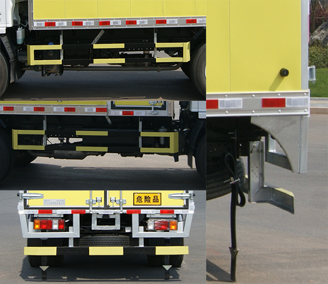 厢体顶部封闭,不可开启,厢体侧面选装对开门或无侧门,边门位置可在厢体中间或中间靠前.选装抗爆容器时,厢体需加装隔断,抗爆容器需安装在隔舱内,此时整备质量为3370kg,内部长度为4020mm,抗爆容器型号ULC-200,生产厂家:浙江路捷顺汽车制造有限公司。该车运输具有独立容器包装的黑火药,压缩黑火药,电引爆雷管,爆破炸药,点燃导火索,聚能装药.运输介质类别和项别号:1.1D,1.1D,1.1B,1.1D,1.4G,1.1D;危险货物运输车种类:EX/Ⅲ。侧面,后面防护装置的横杆材料为Q235,侧、后防护均为螺栓连接,后防护断面尺寸100?0mm,后防护离地高度为400mm; 仅选装安装有ABS的底盘,ABS型号:APG3550500A4,生产厂家:浙江亚太机电股份有限公司. 仅选装安装有盘式制动器、消声器前置的底盘。该车装备有限速装置,限速80km/h。该车仅使用子午线轮胎。该车安装具有卫星定位功能的行驶记录仪。仅采用4KH1CN5HS型发动机,发动机净功率为94kw,发动机油耗值为12.41L/100km. |