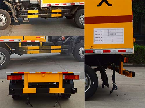 1.厢体顶部封闭不可开启,选装无侧门,选装抗爆容器时,厢体需加装隔断,抗爆容器需安装在隔舱内,此时整备质量为5365kg,内部长度为2930mm,抗爆容器型号ULC-200,生产厂家:浙江路捷顺汽车制造有限公司;2.防护装置材料均为Q235,连接方式均为螺栓连接,后部防护装置断面尺寸为100?0,离地高度为500;3.运送危险货物的品名:黑火药,压缩黑火药,电引爆雷管,爆破炸药,点燃导火索,聚能装药,运输介质类别和项别号:1.1D,1.1D,1.1B,1.1D,1.4G,1.1D;危险货物运输车种类:EX/Ⅲ;4.仅选用安装有前轮盘式制动器,消声器前置,安装具有限速装置,限速80km/h,安装子午线轮胎的底盘;5, ABS型号3631010-C2000,厂商东科克诺尔商用车制动系统(十堰)有限公司;该车安装具有卫星定位功能的行驶记录仪,发动机型号/最大净功率(kw)/油耗(L/100km):YC4FA115-50/80/15.8,YC4S160-50/113/16; |
