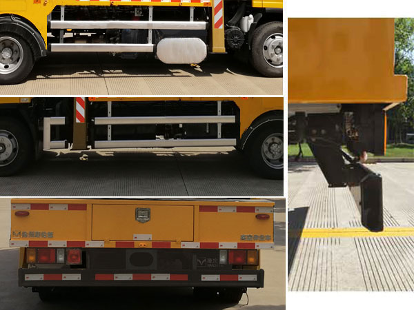 车长为6970mm时后悬为2015mm后伸为30mm、车长为6995mm时后悬为2070mm后伸为0mm。随底盘选装后视镜款式及“NQR”标牌。选装后部工具门样式,选装车辆右侧八联阀安装箱,选装车辆右侧后处理罩壳。该车型装备有支腿,转台,臂架,工作平台等部件的高空作业装置,可将作业人员与工具送到指定高度位置进行作业。ABS系统型号:APG3550500H1,ABS系统生产厂家:浙江亚太机电股份有限公司。侧防护材质为6063铝,与副车架用螺栓连接;后防护材质为Q345钢,与副车架采用焊接连接,后防护断面尺寸130mm?0mm,下缘离地高度480mm。 |