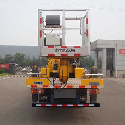 后伸:190mm.侧,后防护装置为金属护栏,材质Q235A,侧防护连接方式为螺栓连接,后防护连接方式为焊接式连接.后部防护断面高度:100mm,断面宽:60mm,离地高度:480mm.发动机净功率为94kW;该底盘装ABS,ABS及其控制器型号为:APG3550500A4,生产厂家为:浙江亚太机电股份有限公司.选装玻璃钢作业斗,选装时,整车高度为3160mm.该车专用装置为高空作业装置,可广泛应用于市政、园林、路灯、电力、交通等需要高空作业的领域.选装作业斗样式. |