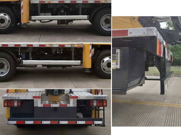 ABS型号:APG3550500A;ABS生产企业:浙江亚太机电股份有限公司;选装部件名称及其相关描述:随底盘选装前照灯,前雾灯,前位灯,前转向灯,前脸,前保险杠。选装后视镜,选装门框下边框黑色贴膜,选装新四孔号牌板。选装工作平台样式,选装固定支腿样式;所用材料材质、连接方式以及后部防护装置的主要尺寸参数(断面尺寸和离地高度):侧防护材质为6063铝,连接方式为螺栓连接;后下部防护材质为Q235钢,连接方式为螺栓连接,断面尺寸为120mm?0mm,下缘离地高度400mm;专用功能及装置描述:该车型装备有支腿,转台,臂架,工作平台等部件的高空作业装置,可将作业人员与工具送到指定高度位置进行作业;后伸尺寸:330mm; |