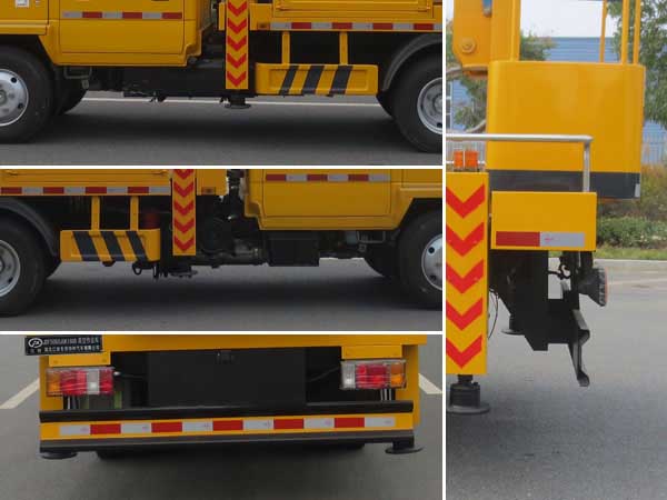 前伸840mm;后伸295mm;随底盘选装驾驶室;吊钩为选装件;选装支腿样式,选装侧防护样式;侧面防护及后下部防护装置材料材质:Q235,连接方式:焊接加螺栓连接;后下部防护装置断面尺寸(宽赘?:30?00(mm),离地高度:400mm;随底盘选装制动系统:装液压制动系统时,ABS及其控制器型号/生产企业对应关系为:APG3550500A/浙江亚太机电股份有限公司,CM4YL/广州瑞立科密汽车电子股份有限公司;装气压制动系统时,ABS及其控制器型号/生产企业对应关系为:CM4XL-4S/4M/广州瑞立科密汽车电子股份有限公司;主要专用装置为折叠臂,用于抢修电力、通讯、路灯等高空作业. |
