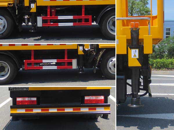 前伸/后伸/轴距/前悬/后悬对应关系为(mm):505/210/2700/1040/1540,488/210/2700/1057/1540,355/无后伸/2950/1040/1650,338/无后伸/2950/1057/1650;整备质量(kg)/准乘人数(人)对应关系:4365/2,4300/3;随底盘选装驾驶室;吊钩为选装件;选装整车外观;侧面防护及后下部防护装置材料材质:Q235,连接方式:焊接加螺栓连接;后下部防护装置断面尺寸(宽赘?:30?00(mm),离地高度:410mm;选装后防护结构,断面尺寸(宽赘?:50?00(mm),离地高度:390mm;ABS厂家及型号:襄阳东风隆诚机械有限责任公司/ABS/ASR-24V-4S/4M;主要专用装置为折叠臂,用于抢修电力、通讯、路灯等高空作业. |